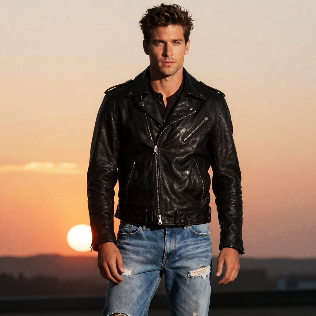 Man Wearing Black Leather Biker Jacket and Distressed Jeans at Sunset