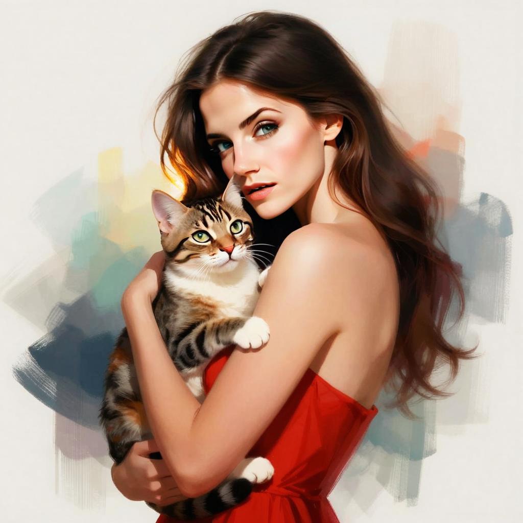 A young woman in a red dress tenderly embraces a tabby cat, both gazing softly towards the viewer. The image combines lifelike portraiture with artistic brushstroke elements in the background, giving it a refined and modern digital painting style.