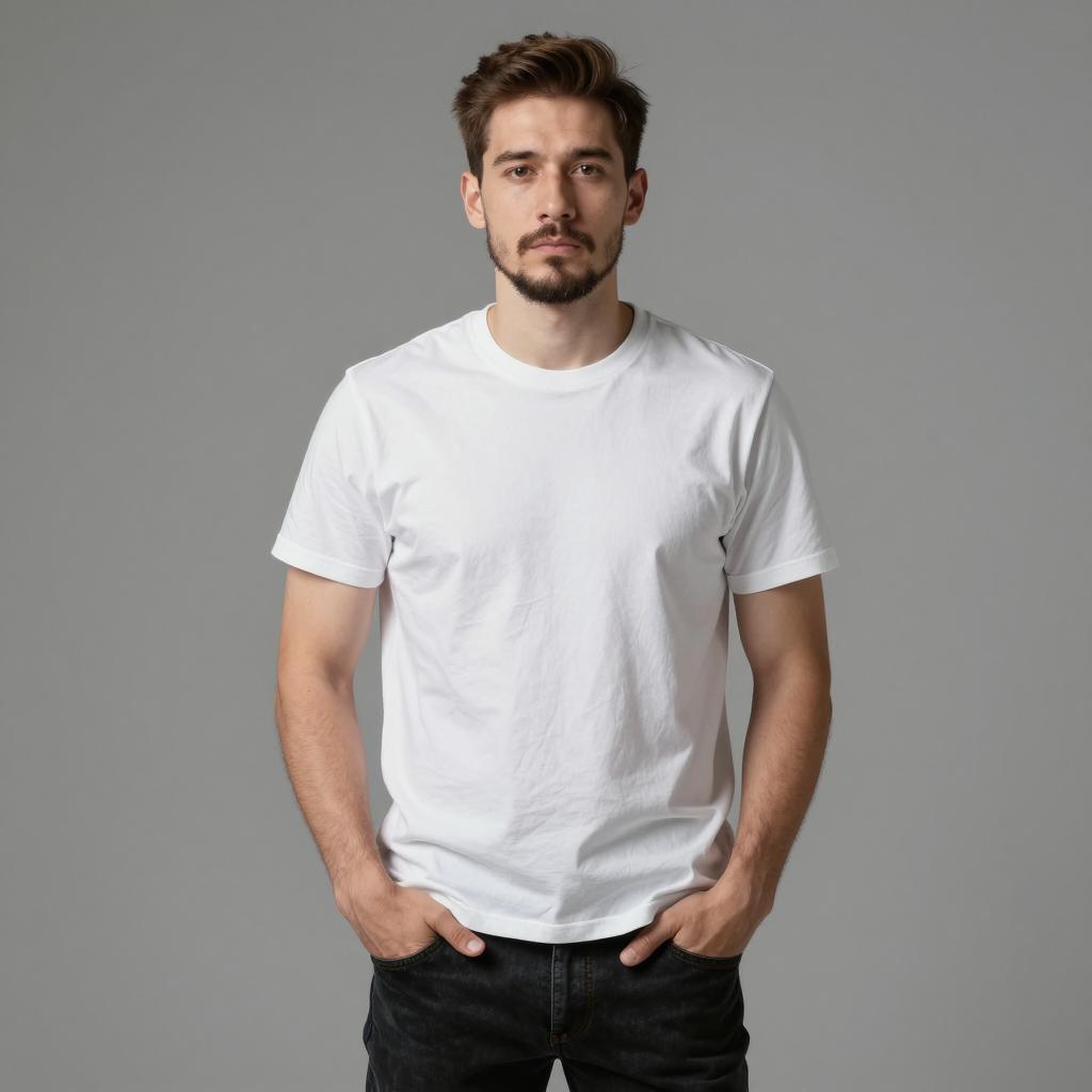 A young man with a serious expression stands confidently against a plain gray background, wearing a simple white t-shirt and black jeans. The image captures a modern, casual style with an emphasis on minimalism and natural lighting.