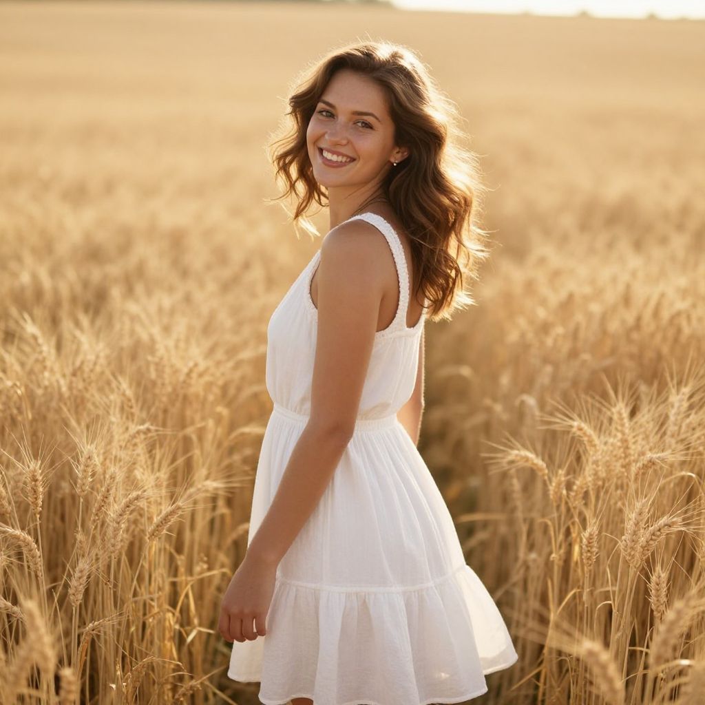 A young woman in a flowing white dress stands smiling in a golden wheat field, bathed in warm sunlight. The natural setting combined with her relaxed pose captures a serene and joyful summer moment.