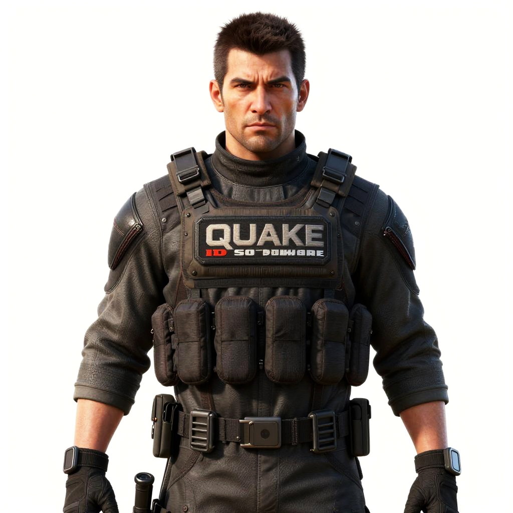 A stern-looking man dressed in tactical gear stands against a white background, exuding the presence of a professional soldier or special forces operative. His armored vest is prominently labeled 'QUAKE,' highlighting a military or combat theme with modern and rugged design elements.