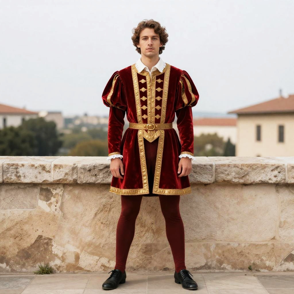 A man dressed in an elaborate Renaissance-style outfit stands confidently against a stone wall with a blurred townscape in the background. His costume features rich red velvet fabric with gold trimming, puffed sleeves, and tight leggings, capturing the distinctive fashion of the Renaissance era.