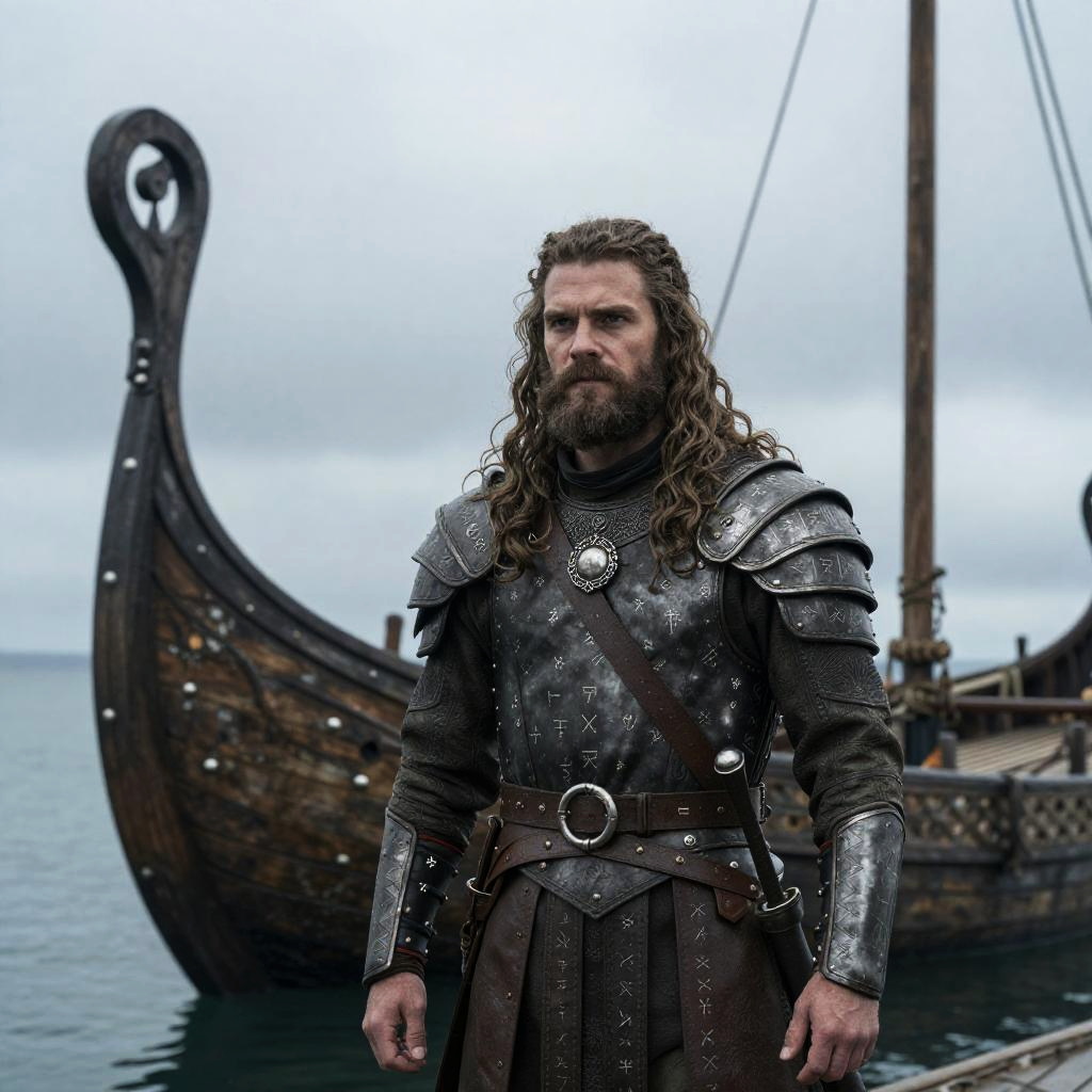 A man dressed in detailed Viking armor stands resolutely on a dock with a traditional wooden Viking longship behind him. The cloudy sky and cold sea set a somber tone, highlighting the historical Nordic warrior aesthetic with authentic armor and runic engravings.