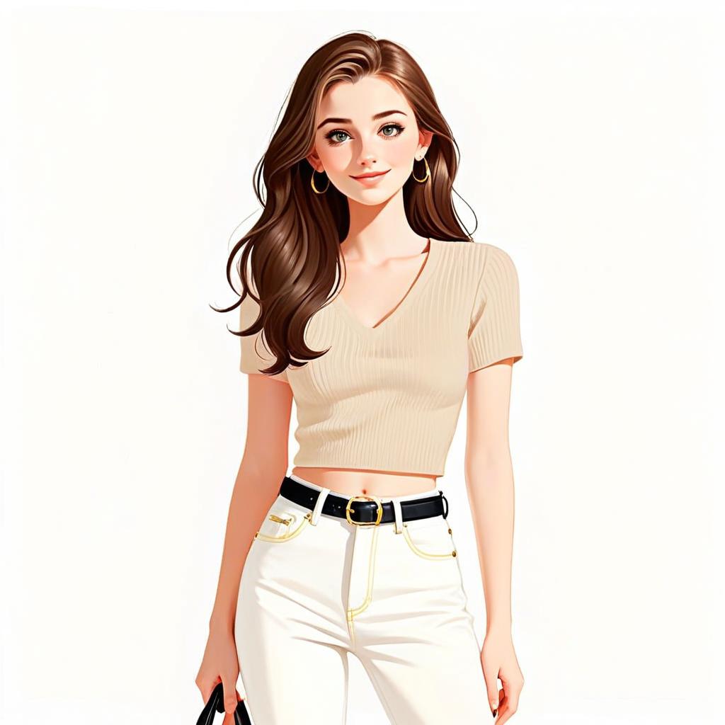 This digital illustration features a stylish woman with long, flowing brown hair and a radiant smile. She is dressed in a casual chic outfit, wearing a beige ribbed cropped top paired with high-waisted white pants and accessorized with gold hoop earrings and a black belt. The clean, modern art style highlights her graceful posture and fashionable appearance.