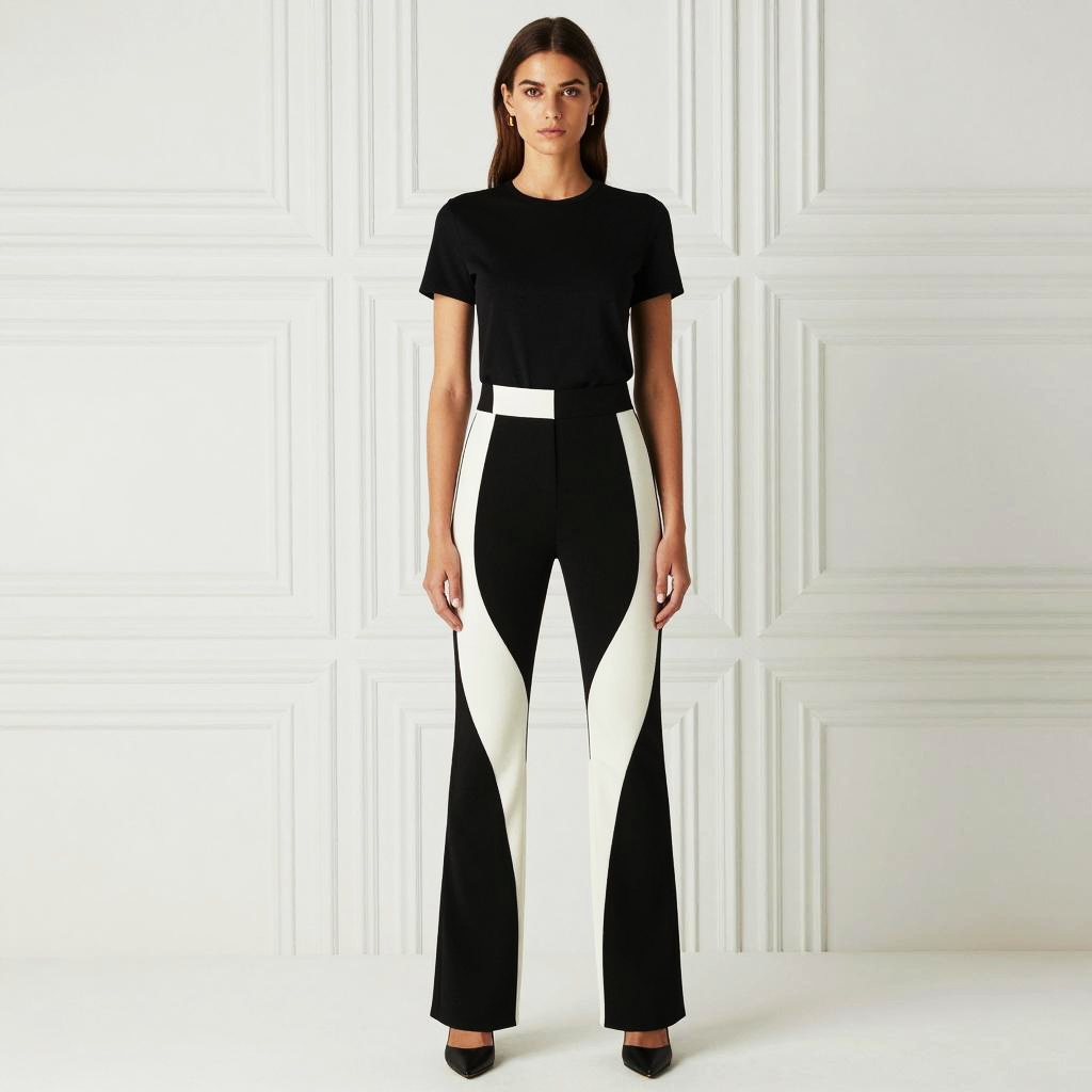 A woman stands confidently against a white paneled wall, wearing a sleek black t-shirt paired with high-waisted black and white pants featuring a bold, Curvy color-block design. The outfit combines minimalism with modern graphic style, highlighting contemporary fashion trends for Generation Z.