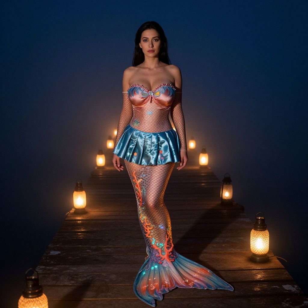 A woman dressed in an elegant and detailed mermaid costume stands on a wooden pier illuminated by warm lantern lights during twilight. The outfit features a shimmering blue and coral tail with intricate patterns and a matching corset-style top, creating a captivating and mythical aesthetic.