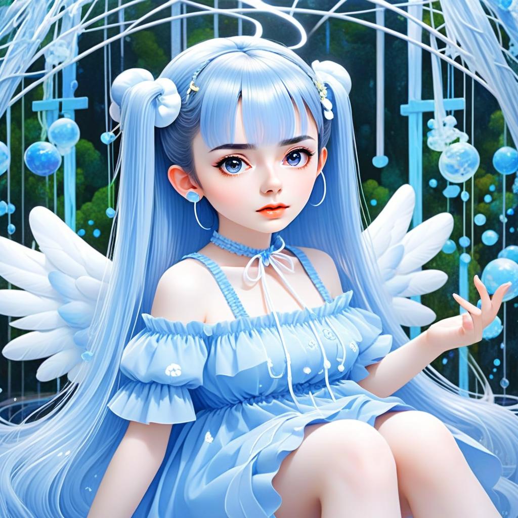 This digital anime-style artwork features a young woman with long, flowing blue hair styled in twin tails, adorned with delicate accessories. She wears a blue off-shoulder dress with ruffles and sits gracefully with ethereal white wings behind her, creating a fantastical and dreamy atmosphere. The soft lighting and detailed background elements enhance the enchanting aesthetic of the illustration.