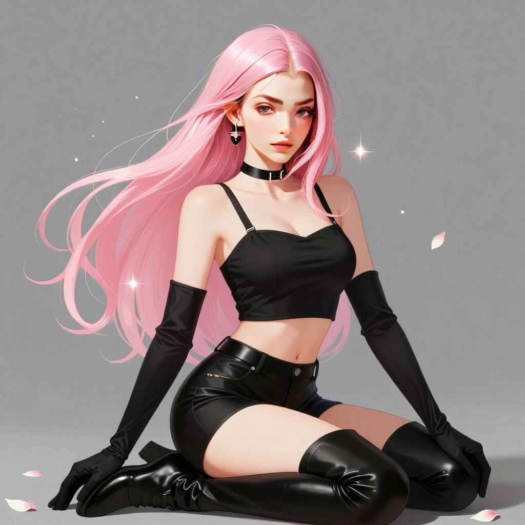 An elegant digital illustration of a woman with long flowing pink hair, dressed in a stylish black crop top, high-waisted shorts, and thigh-high boots. The image showcases a blend of modern fashion and fantasy elements, highlighted by the glossy texture of her outfit and the subtle sparkling effects around her.