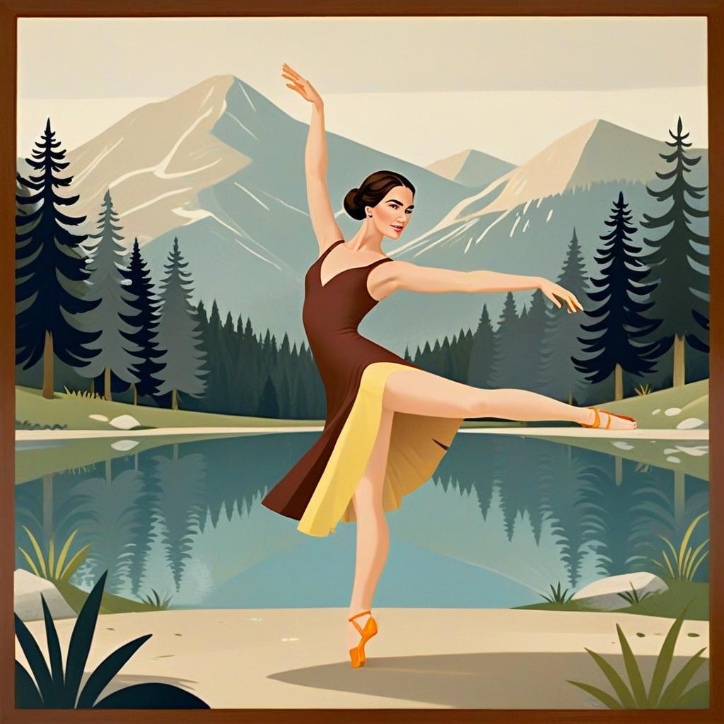 A graceful woman ballerina dressed in a flowing brown and yellow dress dances elegantly on pointe near a serene mountain lake, surrounded by tall pine trees. The artwork, rendered in a smooth digital illustration style, captures the harmony between the dancer's poised motion and the tranquil natural landscape.