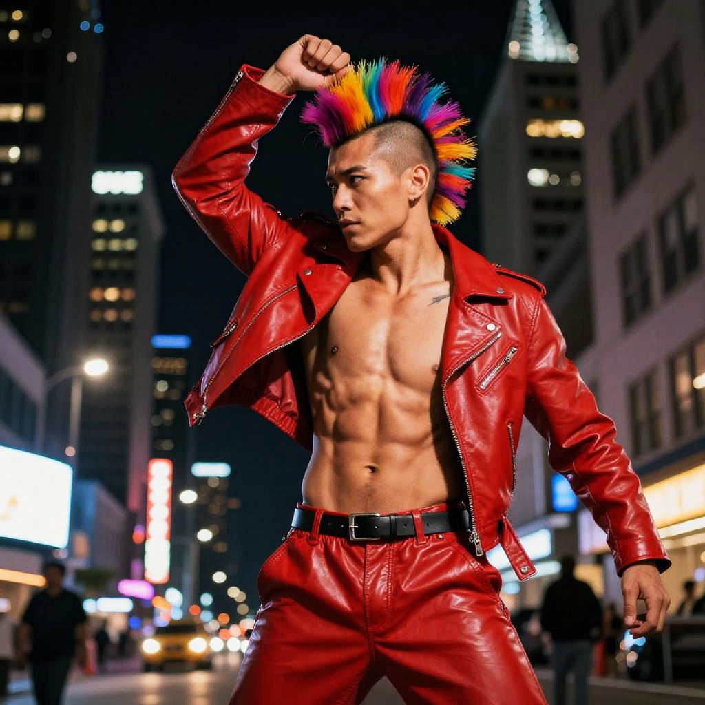 A young man with a brightly colored rainbow mohawk and a red leather jacket and pants strikes a dynamic pose in an urban nighttime setting. His muscular, shirtless torso contrasts with the vivid outfit and edgy punk style, set against blurred city lights in the background.