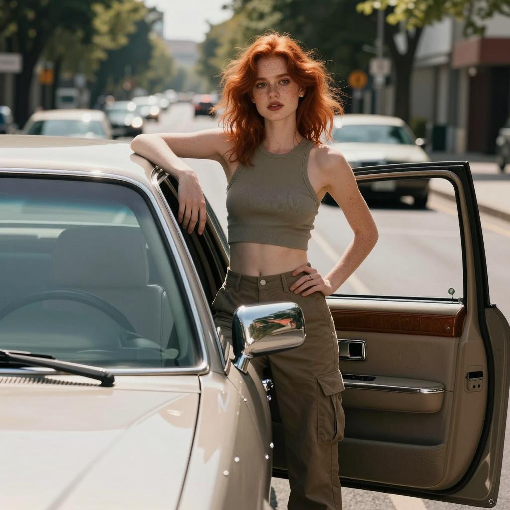A young red-haired woman with freckles, dressed in a casual crop top and cargo pants, leans confidently against a vintage beige car with the driver's side door open. The urban street setting with soft natural light and blurred cars in the background complements the modern yet timeless aesthetic, reflecting a cool Gen Z vibe.