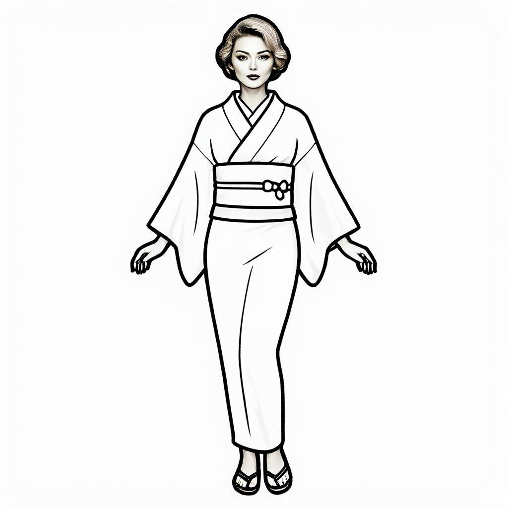 Stylish Woman Wearing Flowing Kimono Black and White Coloring Page