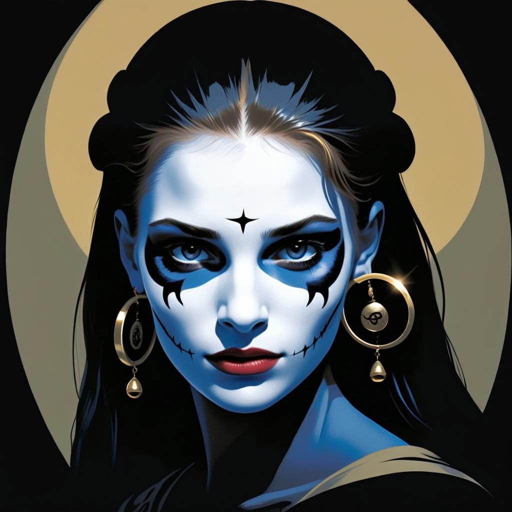 This vibrant artwork features a woman draped in a flowing hood, with striking facial markings and a captivating gaze. The background is a blend of rich reds and soft smoke-like textures, creating a mystical atmosphere that draws the viewer in. The art style combines elements of surrealism and digital painting, showcasing bold colors and intricate details.