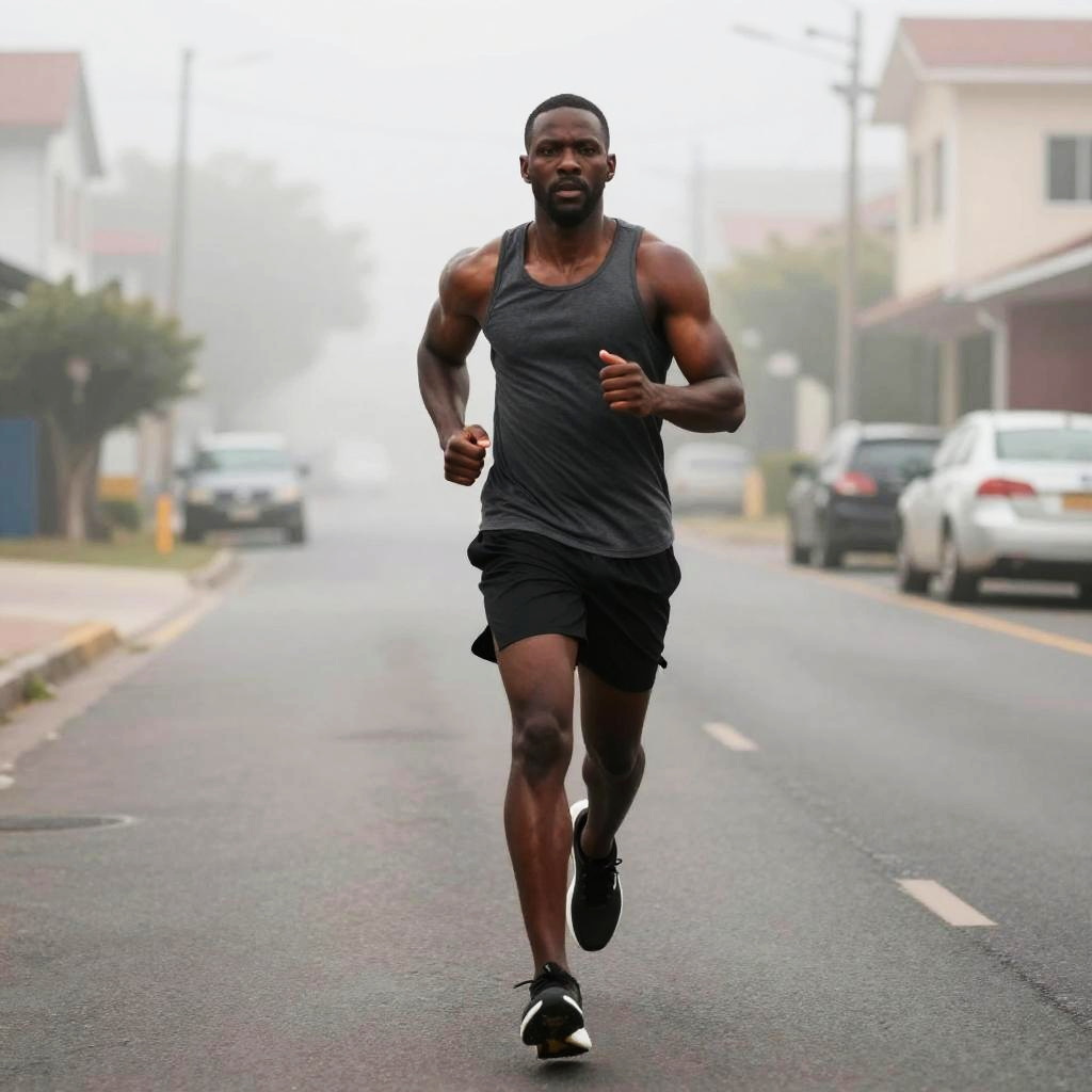 A focused man is running on an urban street early in the morning, wearing athletic gear including a dark sleeveless top and shorts. The misty background and parked cars create a calm, quiet atmosphere that highlights his dedication to fitness and endurance training.