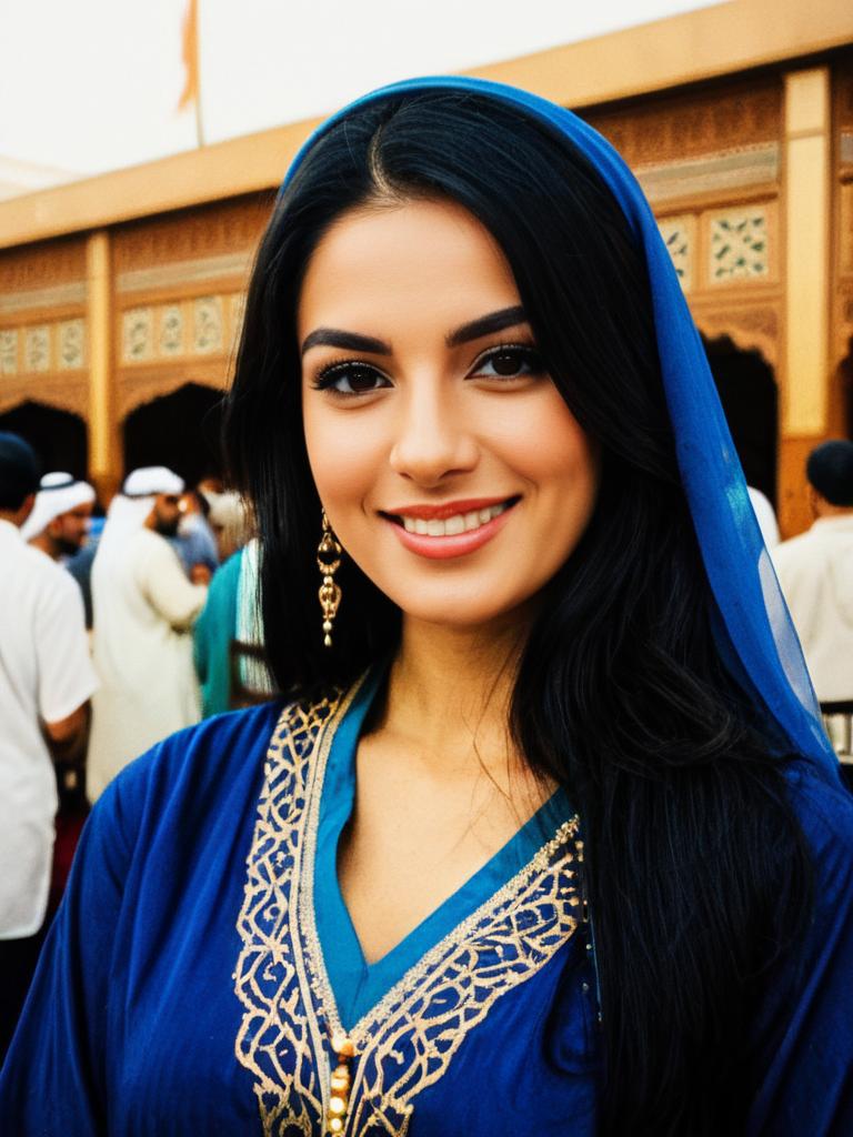 A beautiful woman dressed in a traditional Arabian blue dress with intricate golden embroidery poses candidly at a cultural event. Her elegant attire is complemented by a matching headscarf and ornamental earrings, reflecting the rich heritage and style of Arabian culture.