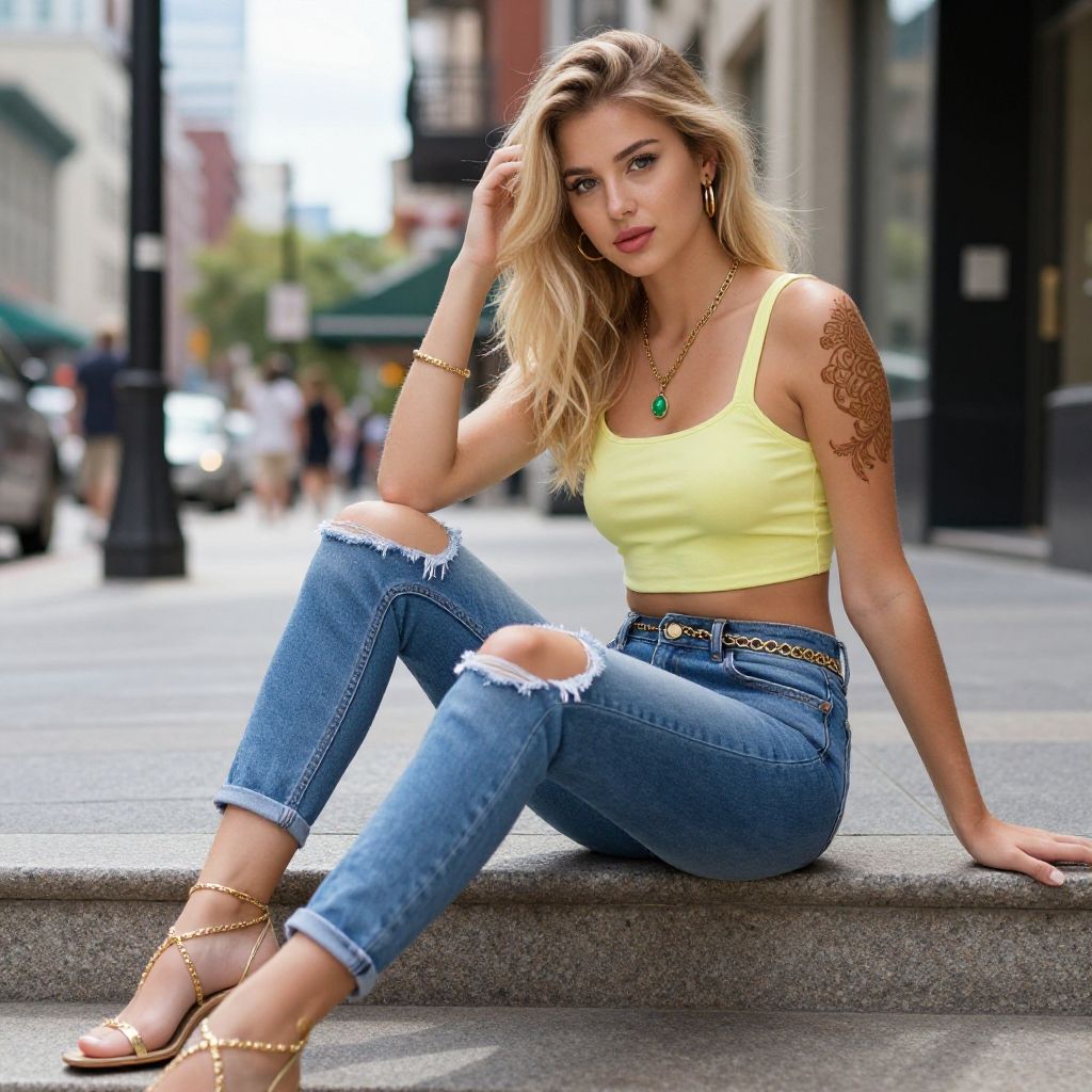 A stylish young woman with blonde hair sits casually on an urban sidewalk step, wearing a yellow crop top and ripped blue jeans. She accessorizes with gold jewelry and a green pendant necklace, while a henna-style tattoo adorns her left upper arm, adding a unique bohemian touch to her modern street style look.
