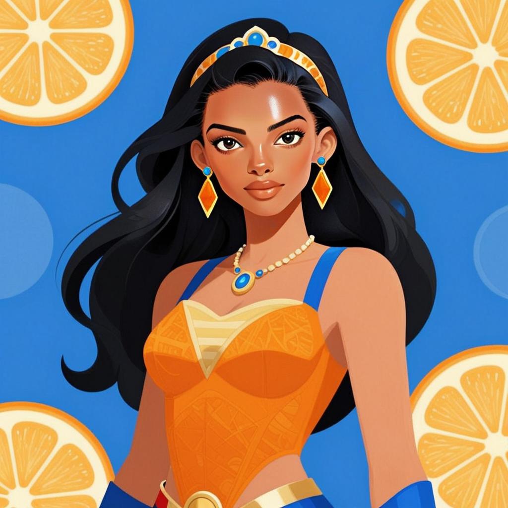 This vibrant digital illustration features a confident woman with long flowing black hair, set against a bright blue background adorned with orange slices. She is dressed in a stylish orange corset top with blue straps and accessorized with matching orange and blue jewelry, showcasing a modern and bold art style with smooth lines and vivid colors.