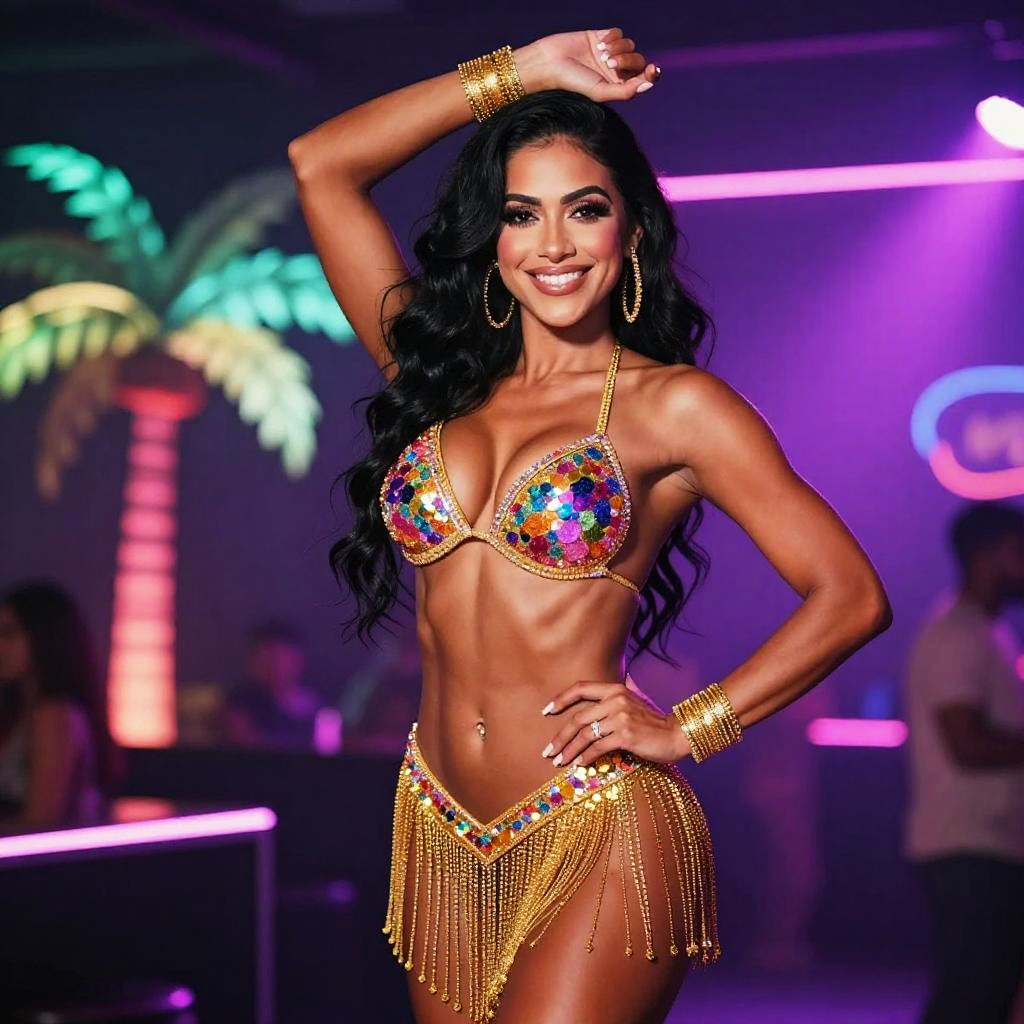 A confident woman poses in a vibrant, sequined carnival costume under stylish club lighting, featuring gold and multicolored accents. The lively background with neon lights and a palm tree adds to the festive, glamorous atmosphere reflective of Brazilian carnival style.