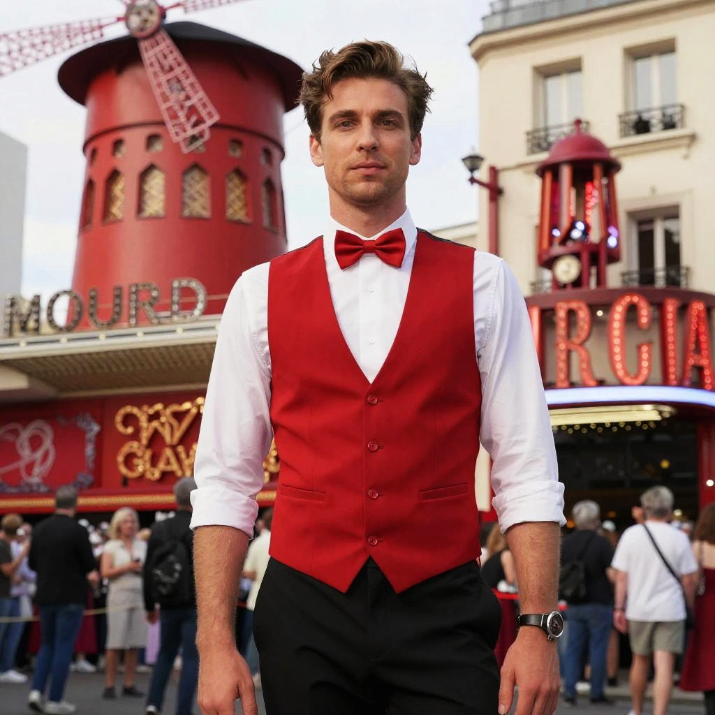A man dressed in a classic Moulin Rouge-inspired outfit featuring a vibrant red vest and matching bow tie over a white shirt, standing confidently in front of the iconic red windmill and bright marquee lights of the Moulin Rouge cabaret in Paris. The image captures the lively atmosphere with blurred crowds and historic architecture in the background.