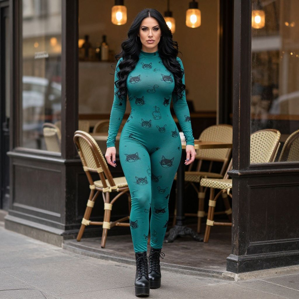 A woman walks confidently on a city street wearing a form-fitting teal jumpsuit covered in black cat illustrations. Her long, dark wavy hair and platform black boots complete the stylish, modern look with a touch of playful charm.