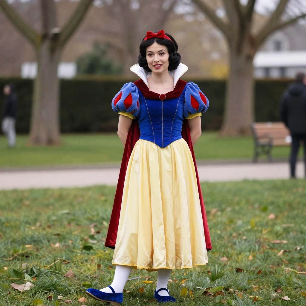 Woman Dressed as Snow White in Classic Costume Standing in Park