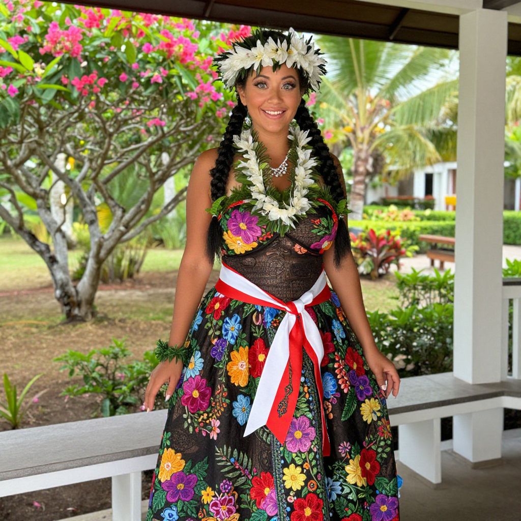 A smiling woman dressed in a vibrant traditional floral dress with a red and white sash stands outdoors, surrounded by tropical plants and trees. She is adorned with a white flower crown, braided hair, and matching floral accessories, embodying a festive island or Polynesian cultural style.