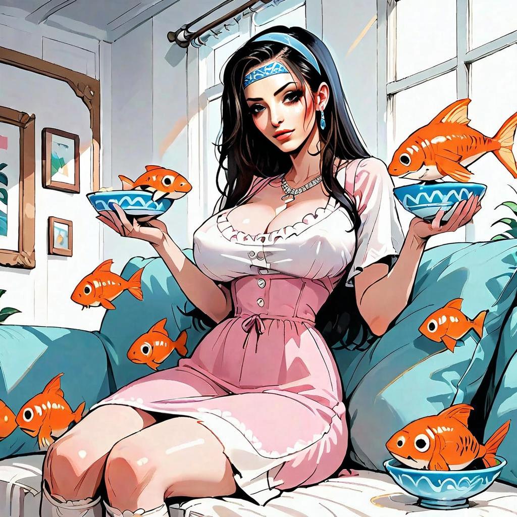 A stylized digital illustration of a woman dressed in a pink dress holding two bowls with large orange goldfish seemingly floating around her in a cozy, sunlit room. The artwork features vibrant colors and a clean anime-inspired style combining realism with cartoon elements.