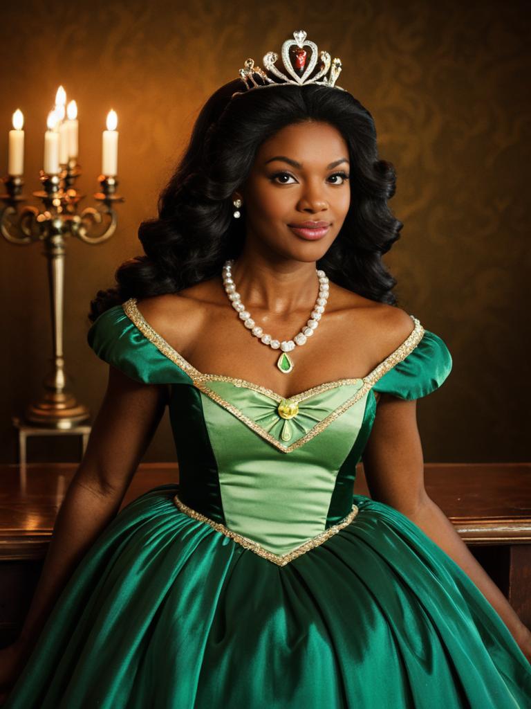 Woman in Princess Tiana Green Dress with Tiara and Pearl Necklace