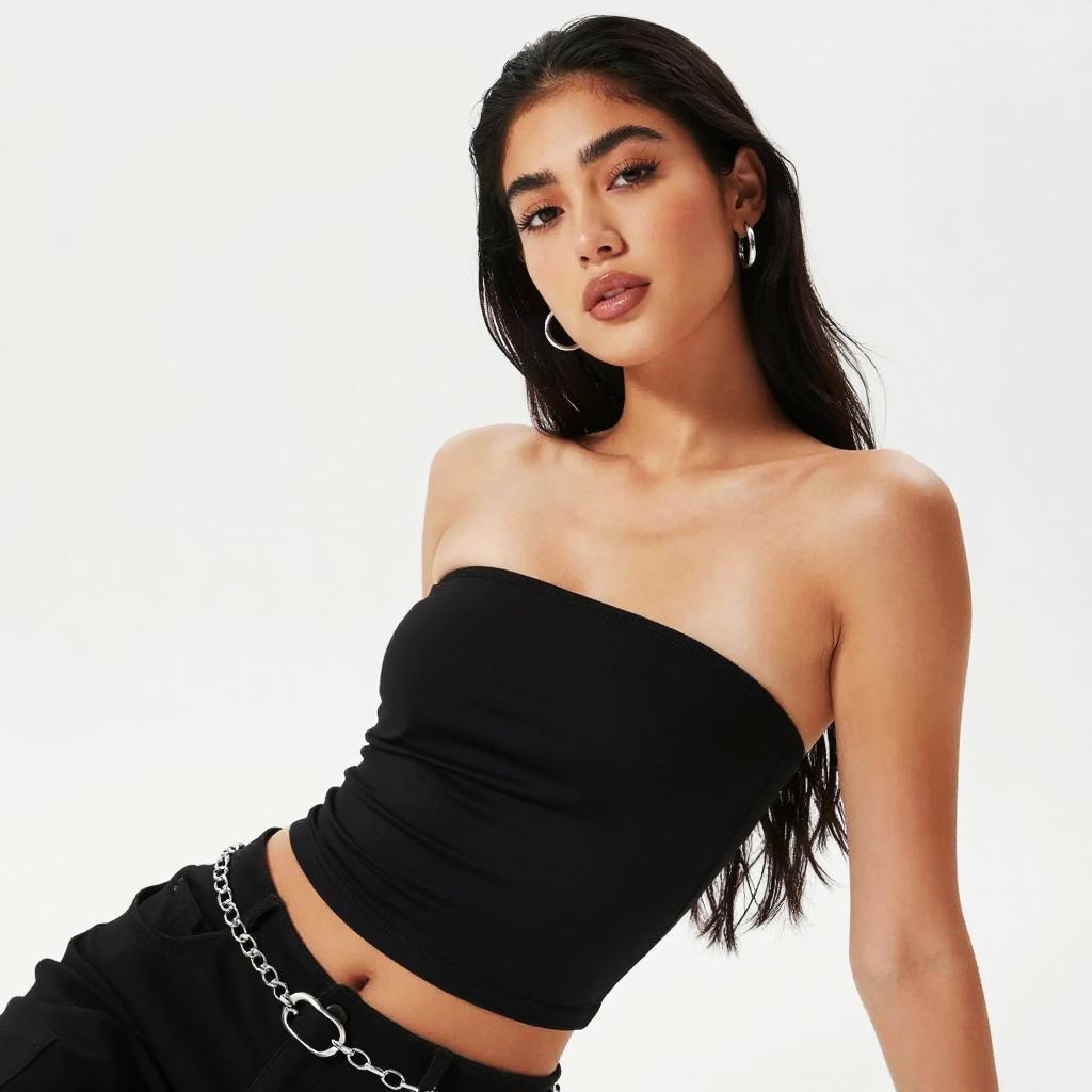 A confident young woman poses against a plain white background, wearing a stylish black strapless tube top paired with black pants and a silver chain belt. Her long dark hair, hoop earrings, and natural makeup emphasize a modern and chic look.