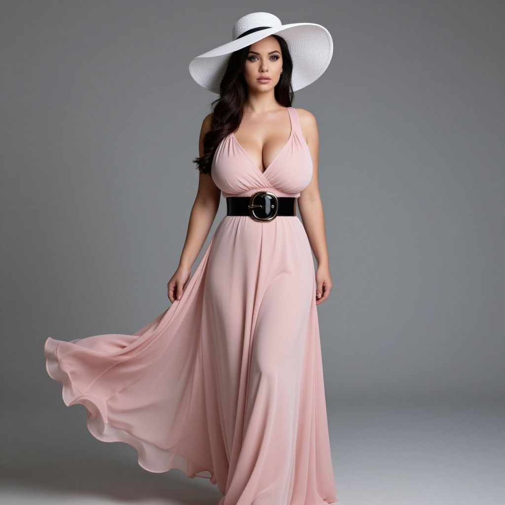 A stylish woman stands confidently against a neutral gray background, wearing a flowing pale pink maxi dress cinched at the waist with a wide black belt. Her look is completed with a wide-brimmed white hat, giving her an elegant and sophisticated appearance.
