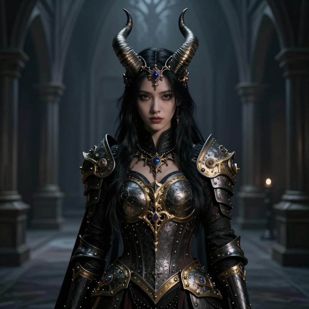 A woman dressed in intricate dark fantasy armor, adorned with elaborate gold and blue embellishments, stands confidently in a Gothic cathedral setting. She wears striking metallic horns as part of her headpiece, embodying a powerful and mystical warrior character with a medieval and fantasy aesthetic.