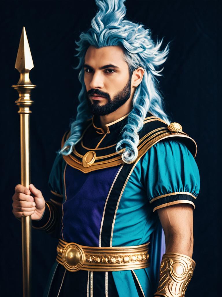 A man cosplaying as Neptune Vasilias, dressed in an elaborate costume featuring vibrant blue and gold armor details, holding a golden spear. His striking blue wig styled in voluminous, swirling waves adds a fantastical and regal touch to the realistic portrait.