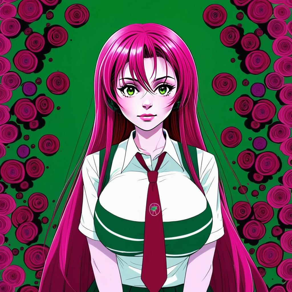 Anime Woman with Pink Hair and Green Eyes in School Uniform