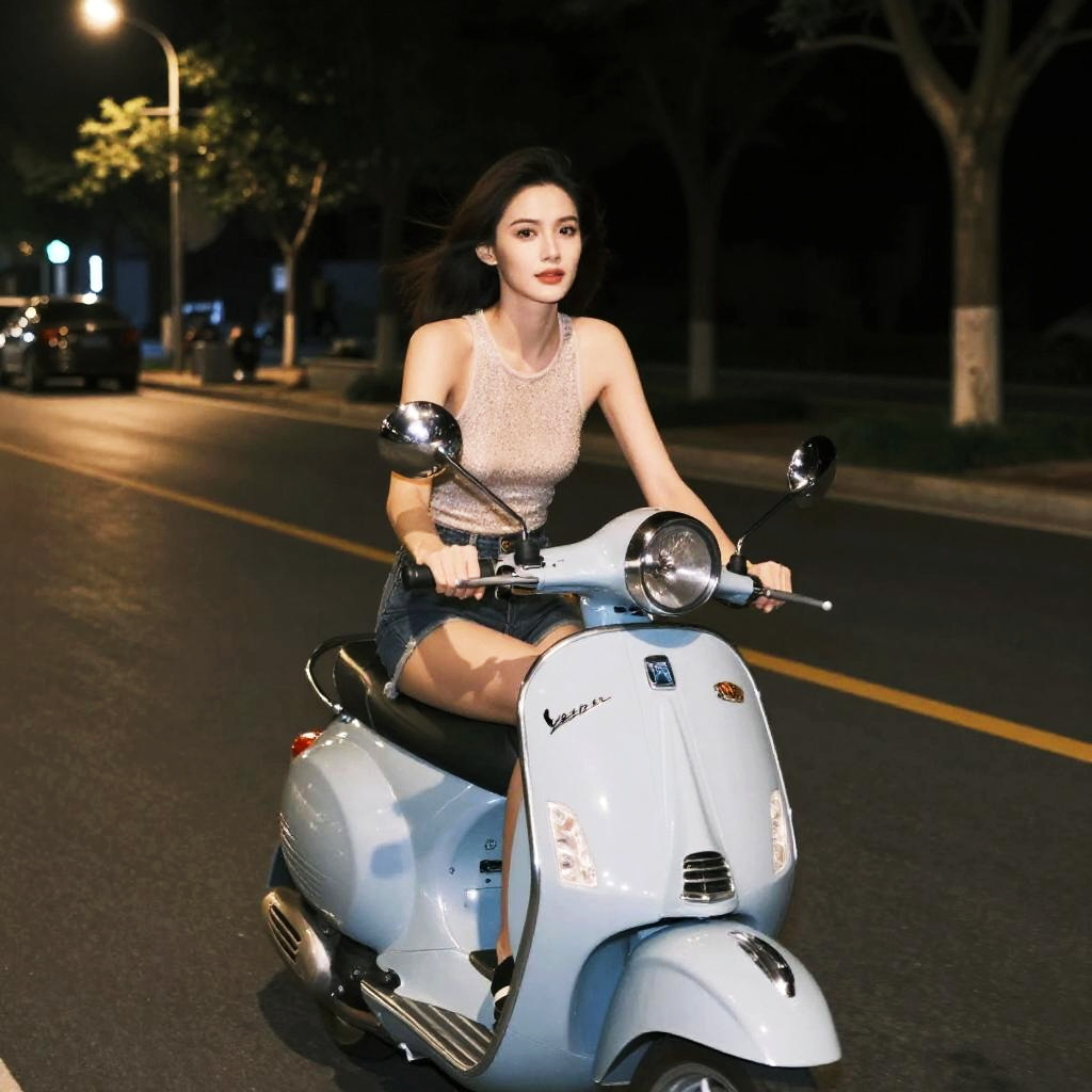 A young woman rides a light blue Vespa scooter on a quiet street at night, showcasing a casual yet stylish look with a sleeveless top and denim shorts. The nighttime urban setting with streetlights creates a serene and slightly adventurous atmosphere.