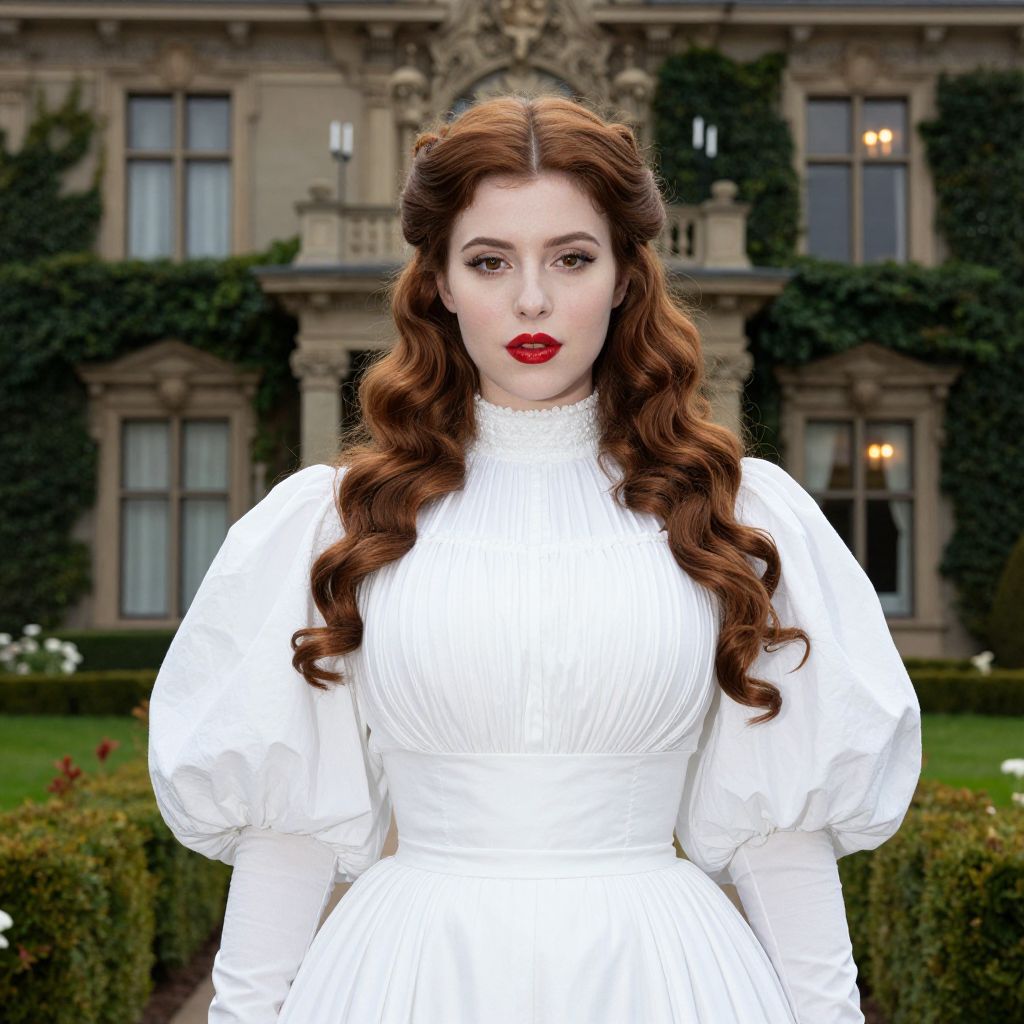 A woman with long wavy red hair styled in vintage curls stands confidently in front of an elegant, ivy-covered mansion. She wears a white Victorian-inspired dress with puffed sleeves and a fitted bodice, highlighting a classic and timeless fashion style.