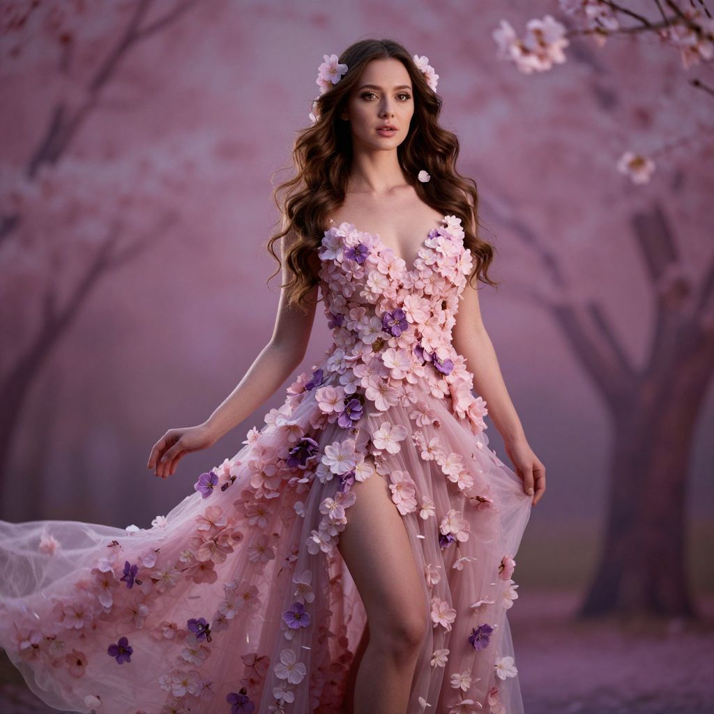 A woman gracefully poses in an enchanting, flowing pink gown adorned with delicate three-dimensional flowers in various shades of pink and purple. Set against a dreamy backdrop of blossoming trees, the scene evokes a whimsical and romantic atmosphere, highlighting the ethereal beauty of spring.