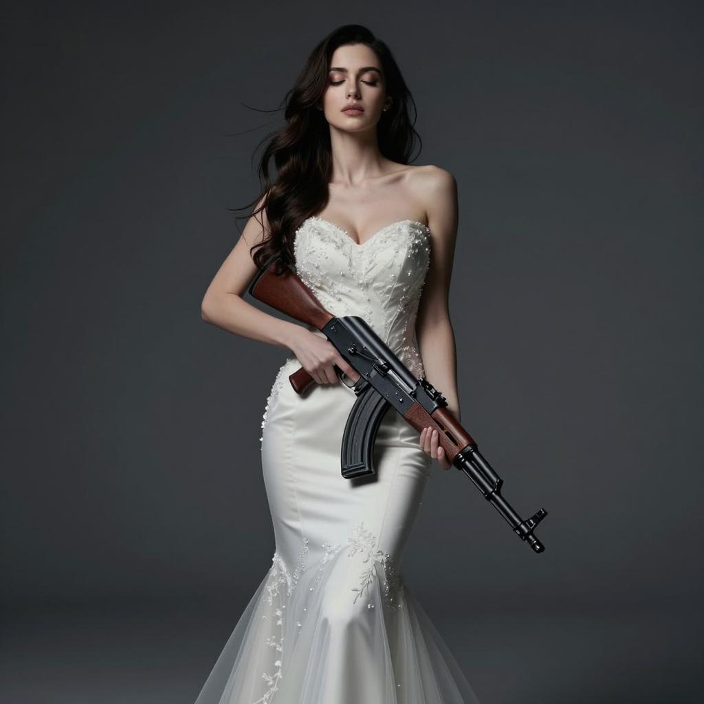 A confident woman in a strapless white wedding gown holding an AK-47 rifle against a dark gray background. The image blends elegance and intensity, highlighting a contrast between bridal beauty and powerful weaponry in a high-fashion style portrait.