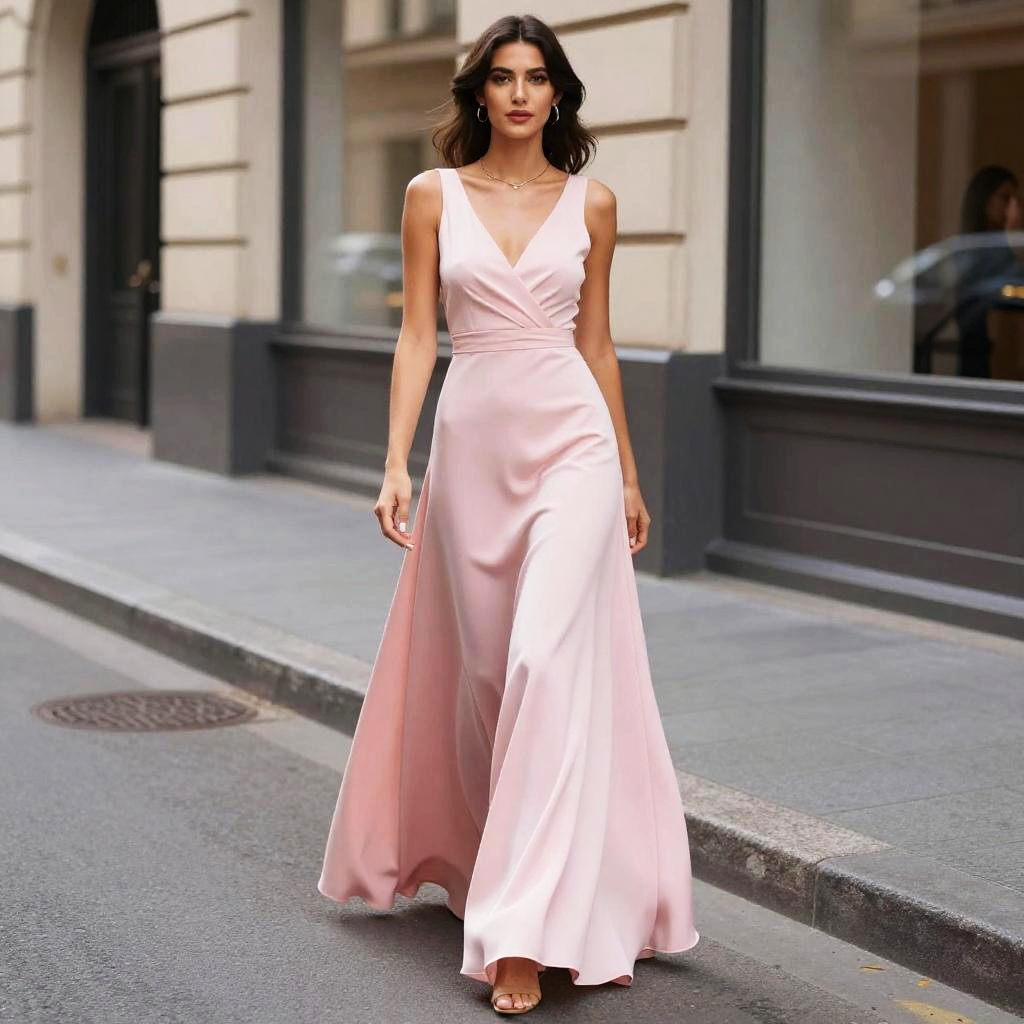 A woman wearing a stylish, elegant pink gown walks confidently on a city sidewalk. The dress features a sleeveless design with a deep V-neckline and a flowing, floor-length skirt, exuding a modern and sophisticated look.