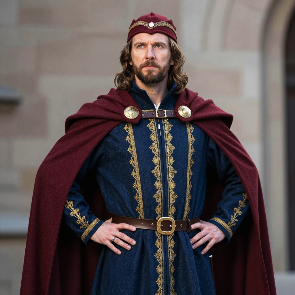 A man dressed in a regal medieval costume stands confidently with hands on his hips, wearing a richly embroidered blue robe and a maroon cape fastened with ornate clasps. His serious expression and period attire suggest a character of nobility or leadership from a historical or fantasy setting.