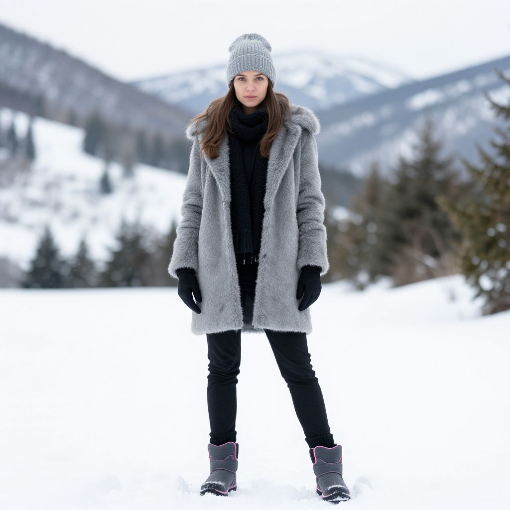A woman stands confidently in a snowy mountainous landscape, dressed warmly in a grey fur coat, black scarf, gloves, and a grey knit beanie. The winter setting with snow-covered ground and blurred pine trees in the background complements her stylish cold-weather attire.