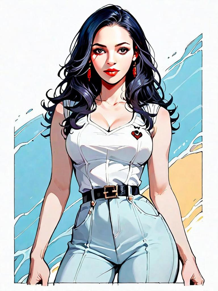 This digital illustration features a confident woman with flowing dark hair and vibrant red lipstick, dressed in a stylish white top and high-waisted light blue jeans with a black belt. The artwork displays a modern comic or manga-inspired style, accentuated by clean lines, bold colors, and a visually appealing background with abstract waves in blue and sandy tones.