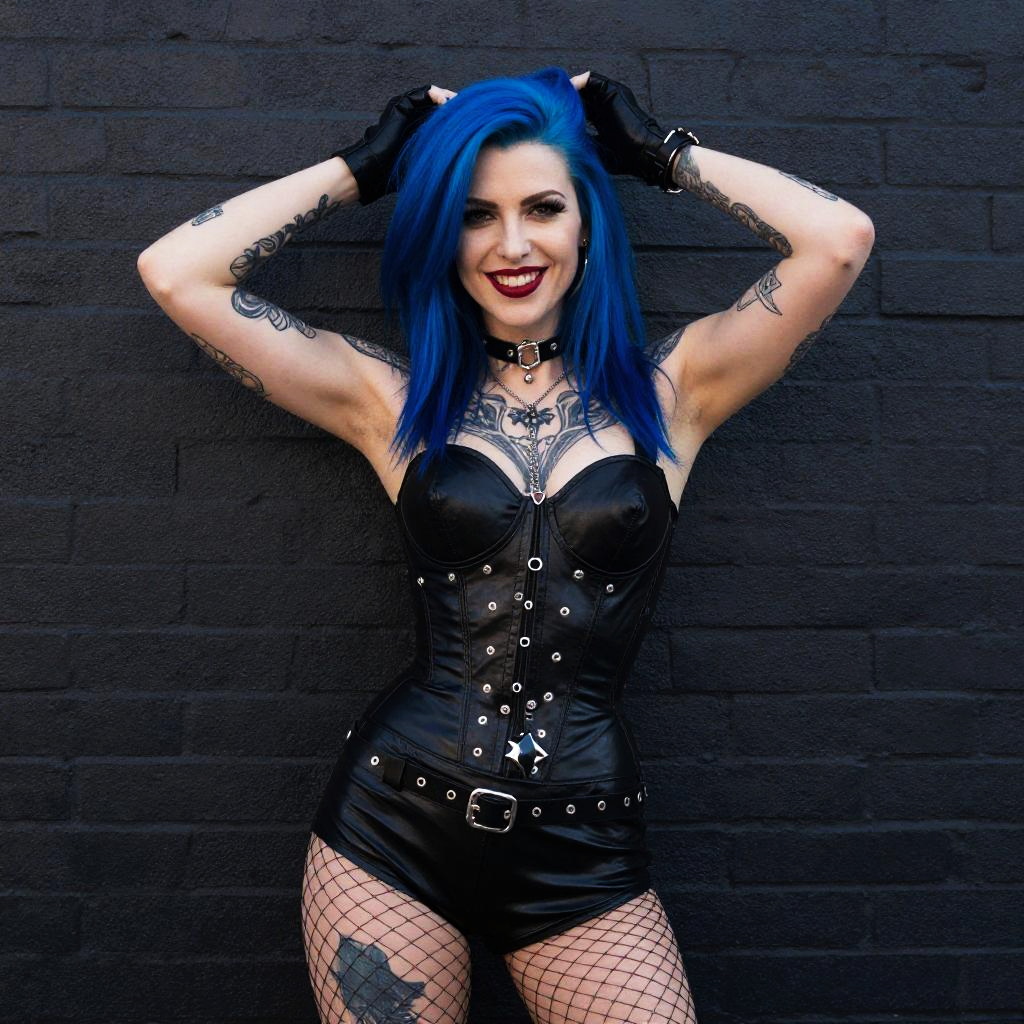 A confident woman with vibrant blue hair poses against a black brick wall, showcasing her edgy style complete with a black leather corset, matching shorts, and fishnet stockings. Her arms reveal detailed tattoos, complementing her alternative, goth-inspired look accented by dark makeup and accessories.