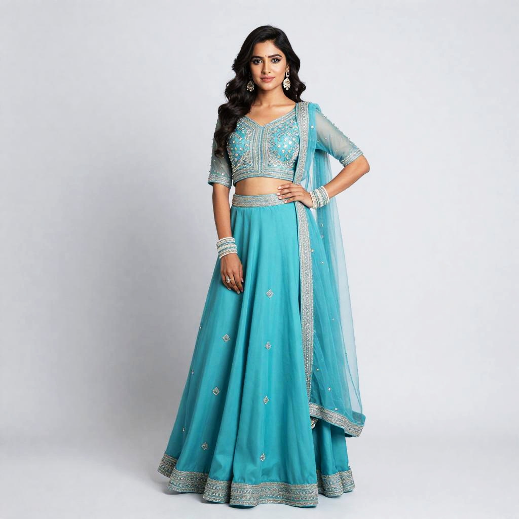 A woman poses gracefully in an aqua blue Indo-western gown, showcasing intricate embroidery and beadwork on the blouse and skirt. The outfit blends traditional Indian elements with modern fashion, featuring a sheer dupatta and matching accessories.