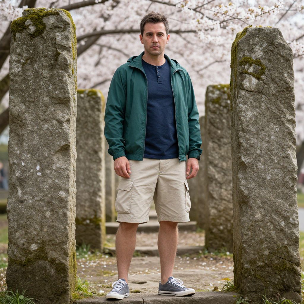 A man stands confidently between ancient stone pillars in an outdoor setting, framed by blooming cherry blossom trees. He wears a green jacket, navy blue henley shirt, and beige cargo shorts, embodying a casual, modern style amidst a natural and historic backdrop.