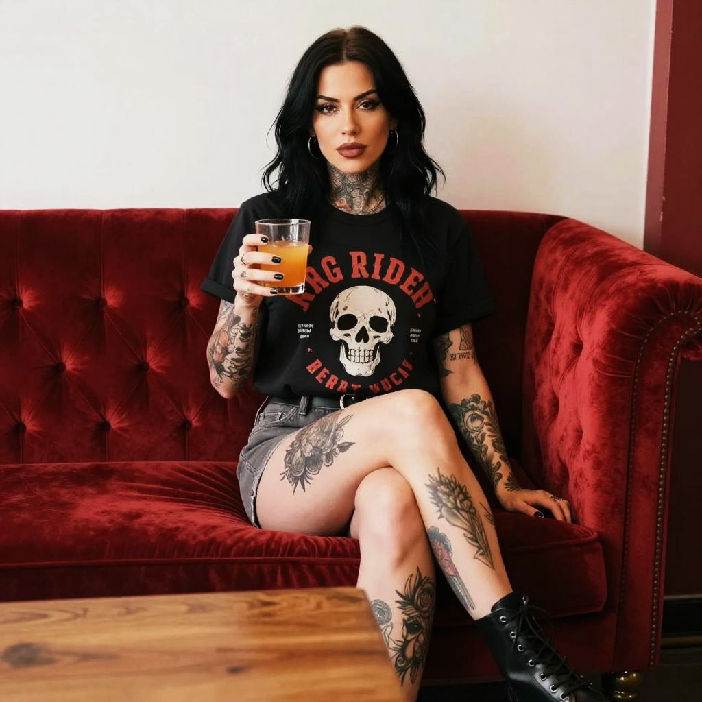 A tattooed woman with dark hair and bold makeup sits confidently on a plush red velvet sofa, holding a glass of orange juice. She wears a black graphic t-shirt featuring a skull design and gray shorts, exuding an edgy, alternative style with visible tattoos on her arms and legs.