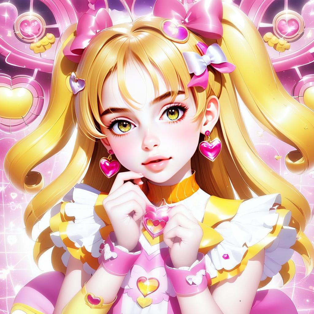 A vibrant anime-style woman with long blonde hair styled in twin tails, adorned with pink and white bows. She wears a colorful, heart-themed magical girl outfit with glowing heart accessories, set against a sparkling pink background that emphasizes her enchanting appearance.