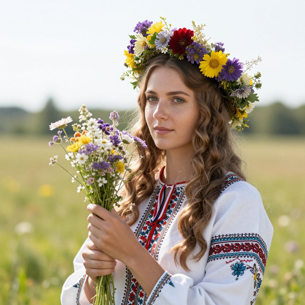 A young woman stands in a sunlit field wearing a traditional embroidered blouse and a vibrant floral wreath on her head. She holds a colorful bouquet of wildflowers, embodying a connection to nature and cultural heritage.