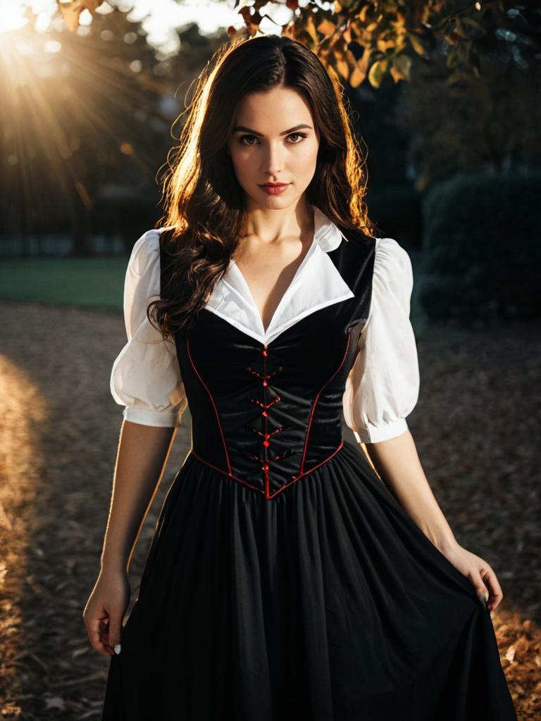 A woman dressed in a stylish black and white vampire fancy dress stands outdoors with the sunlight casting a warm glow behind her. The outfit features a white puff-sleeved shirt paired with a black corset-style bodice with red accents, embodying a classic vampire costume style. The dramatic lighting and autumn setting enhance the elegant and mysterious vibe of the scene.