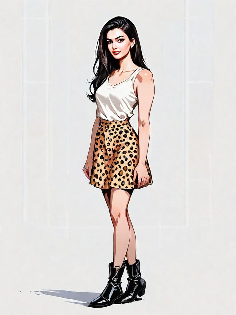 Realistic Comic Style Illustration of Woman in Leopard Print Skirt and White Top