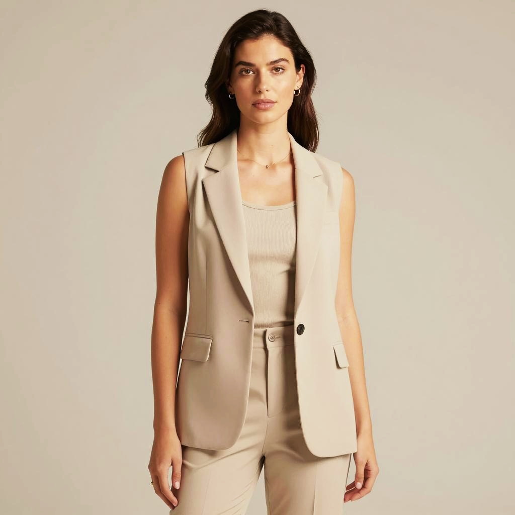Modern Minimalist Beige Sleeveless Blazer Outfit for Women
